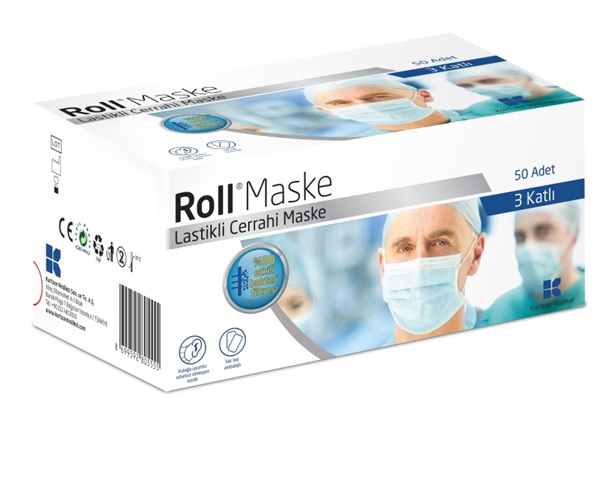 Roll maske, hijyen gereken uygulamalarda yüze uyumlu yumuşak ve esnek yapısı sayesinde rahatsız etmeden kullanılabilir. Tek tek ambalajlıdır. Hava geçirir ve kolay nefes almanıza imkan verir. Alerji yapmaz. 3 katlı yapıya sahiptir. Partikül filtrasyonu %98 ‘dir. Bakterilere karşı güçlü koruma sağlar.